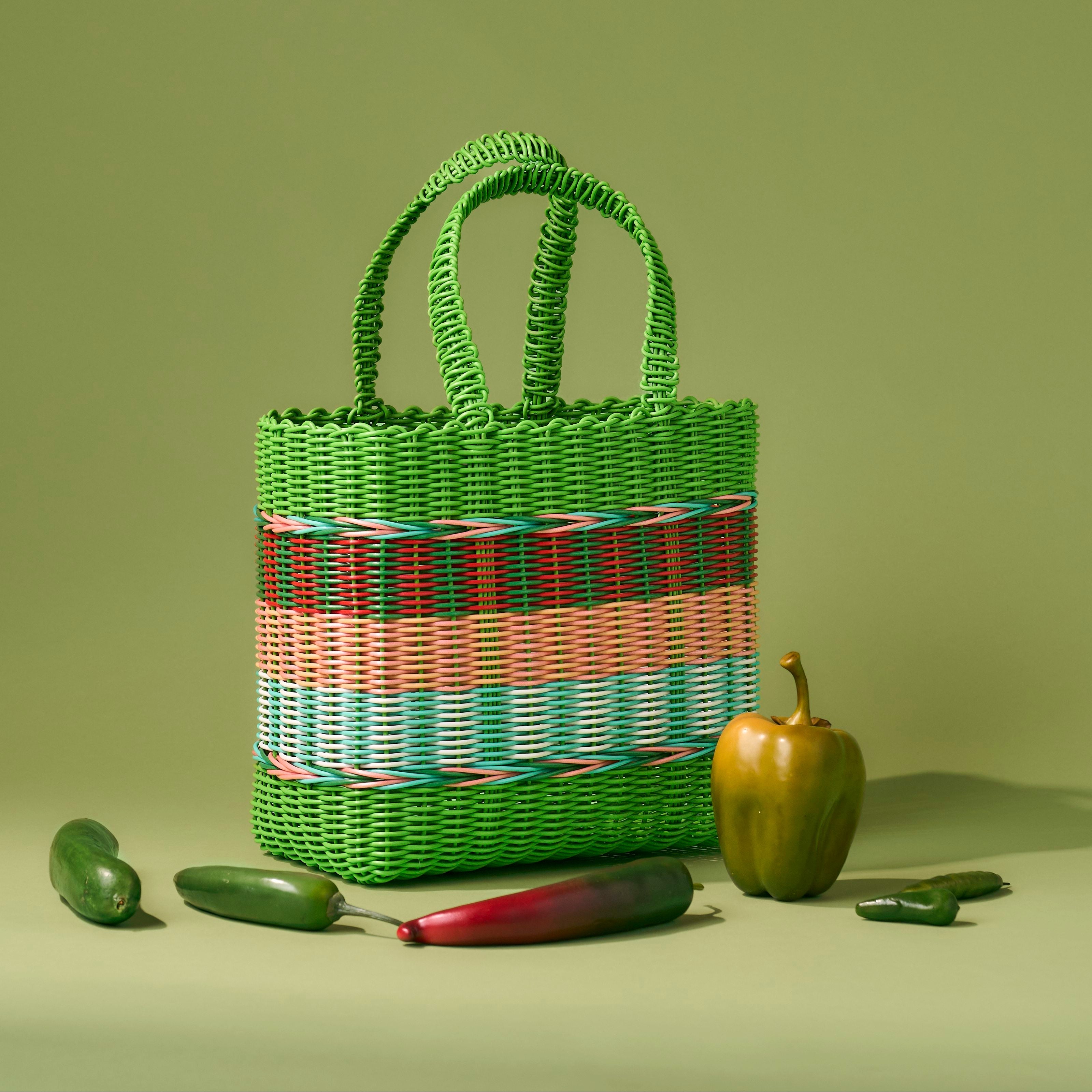 Each Mira bag is individually handwoven in a remote village in Java from new plastic tubing made from recycled PET plastics.