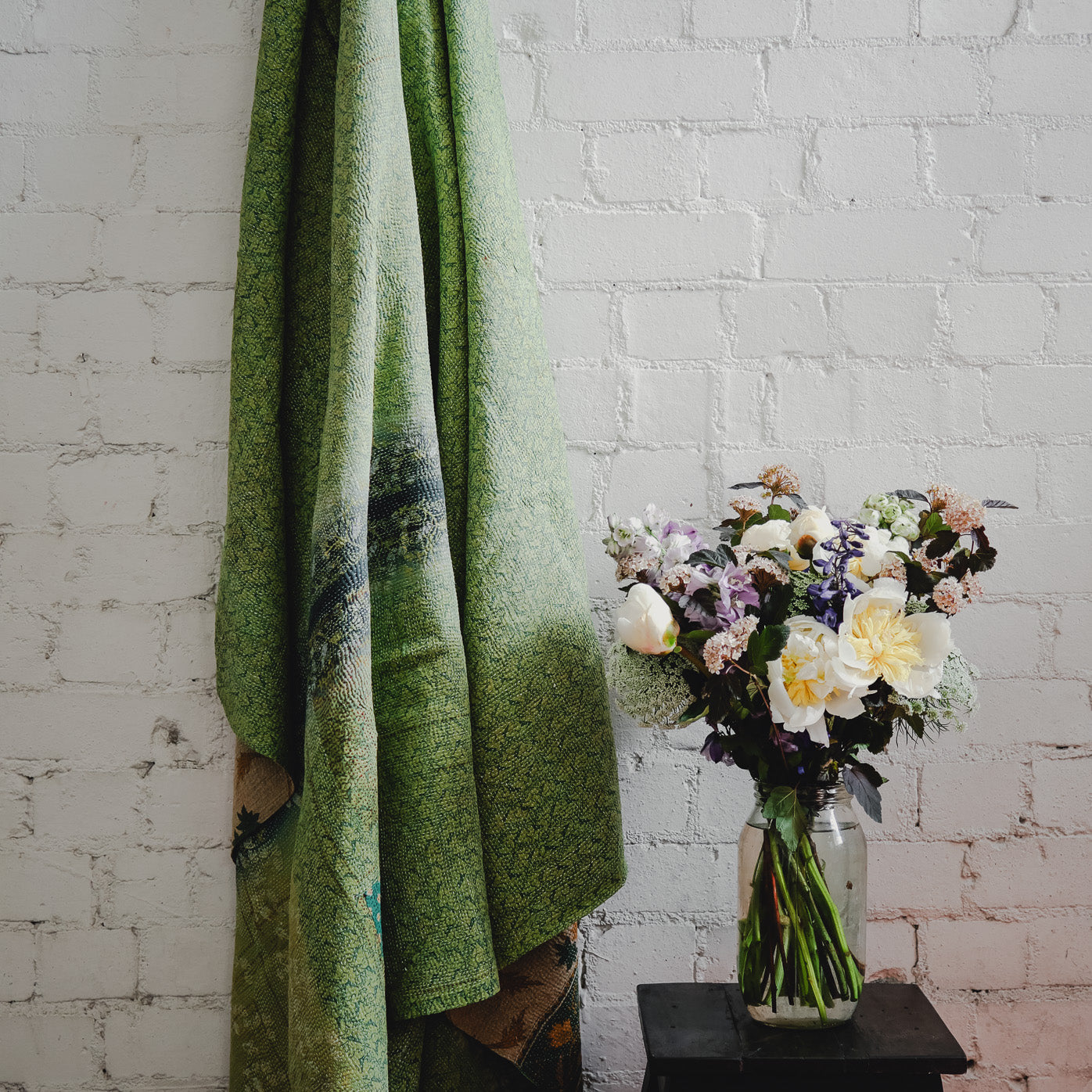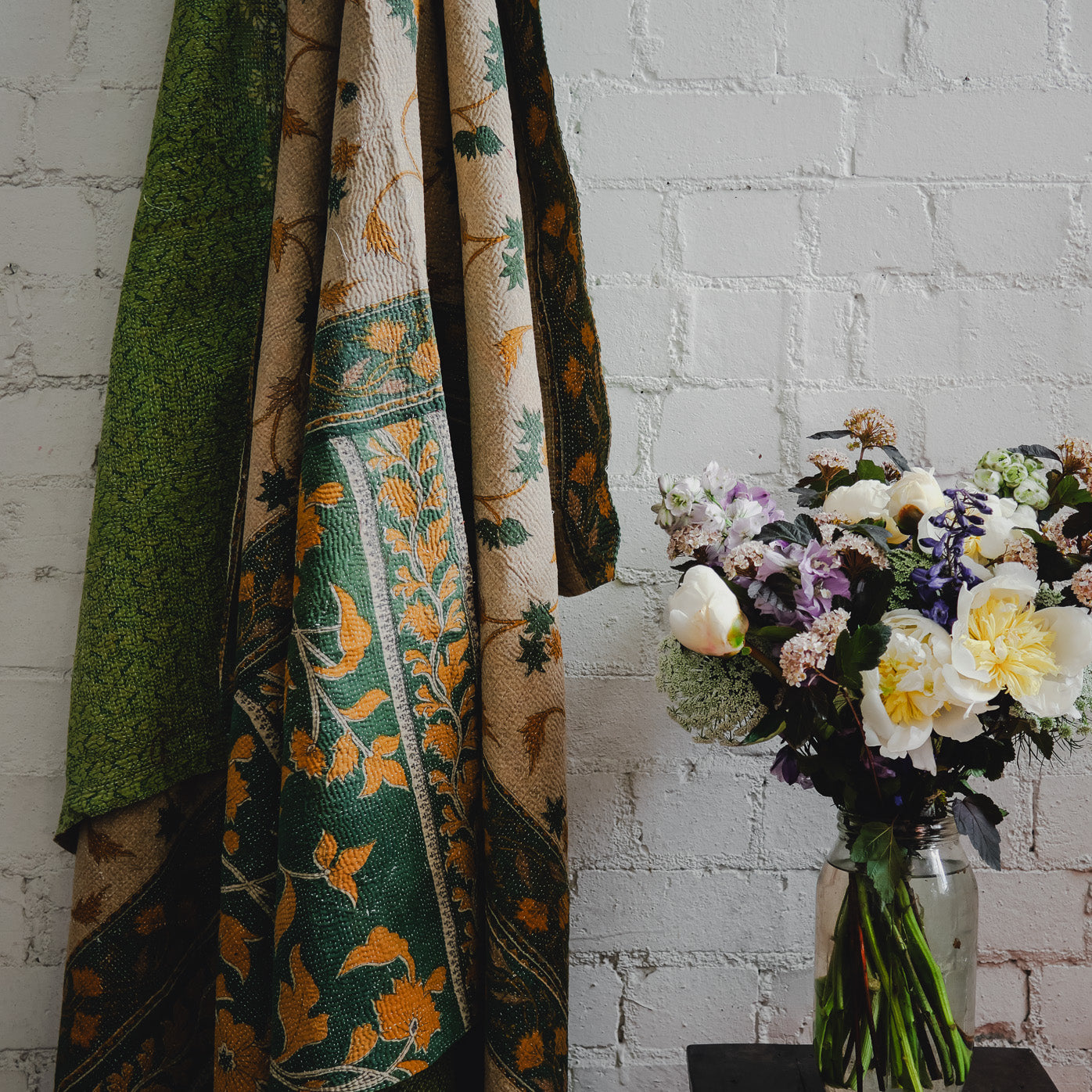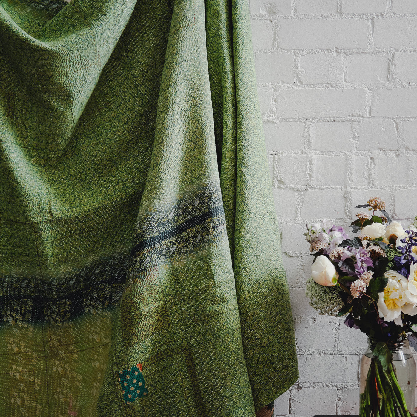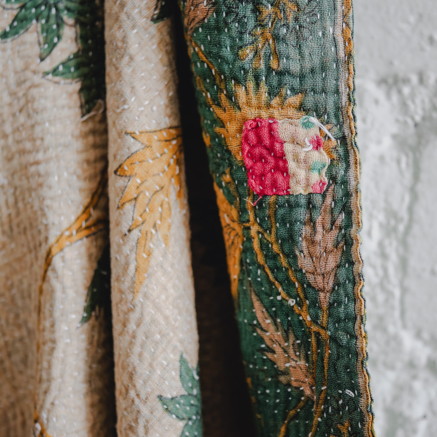 The word 'kantha' refers to a type of running stitch embroidery, which was traditionally used to stitch several layers of cotton together to make a quilt or bedcover or cushion. Often the layers were repurposed saris. Vintage kanthas are beautifully soft and often have small imperfections or patches where they have been mended. Each one is unique and this only adds to their charm.