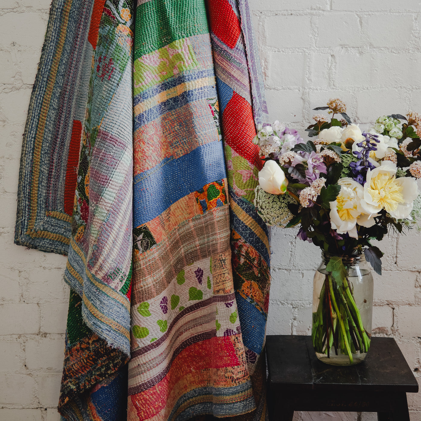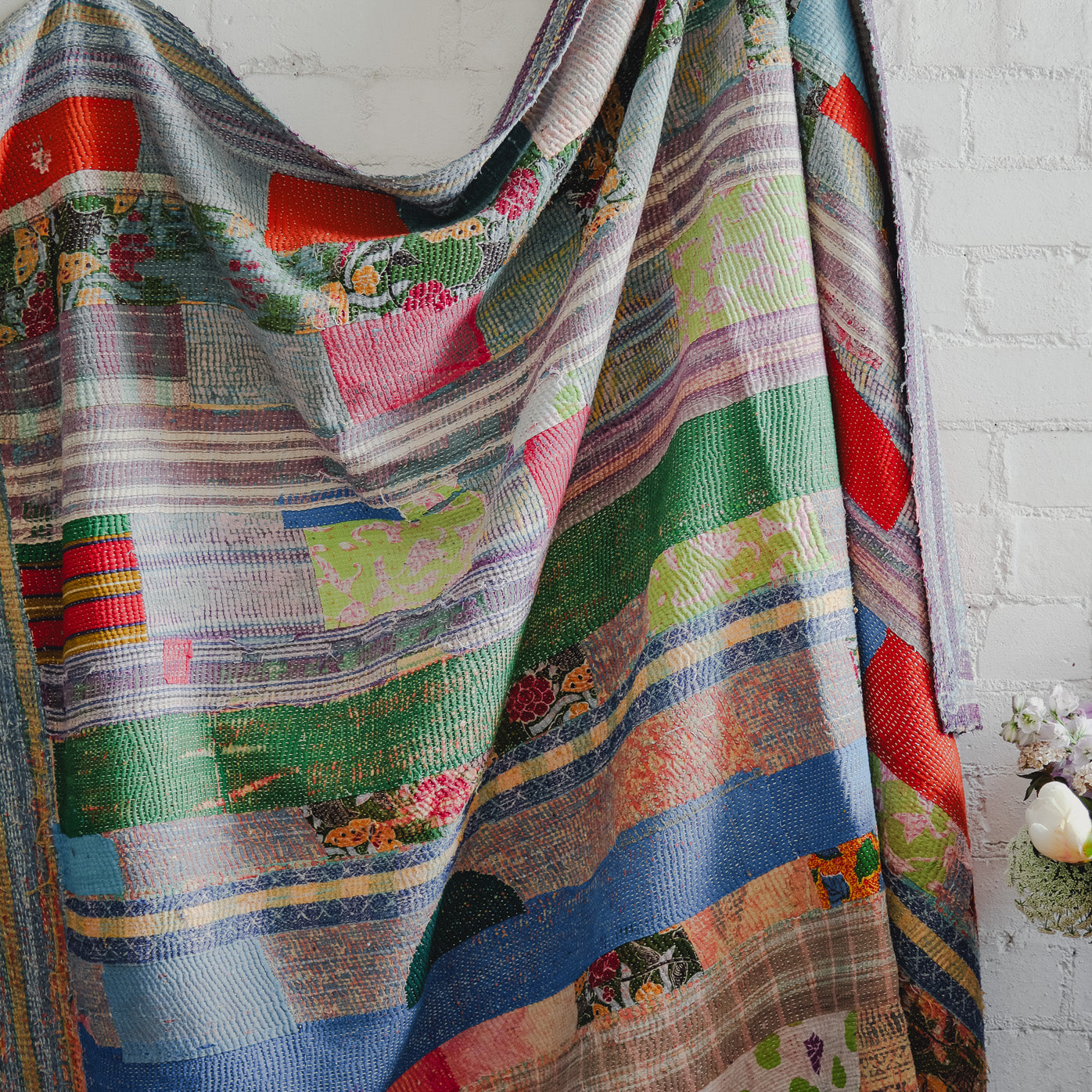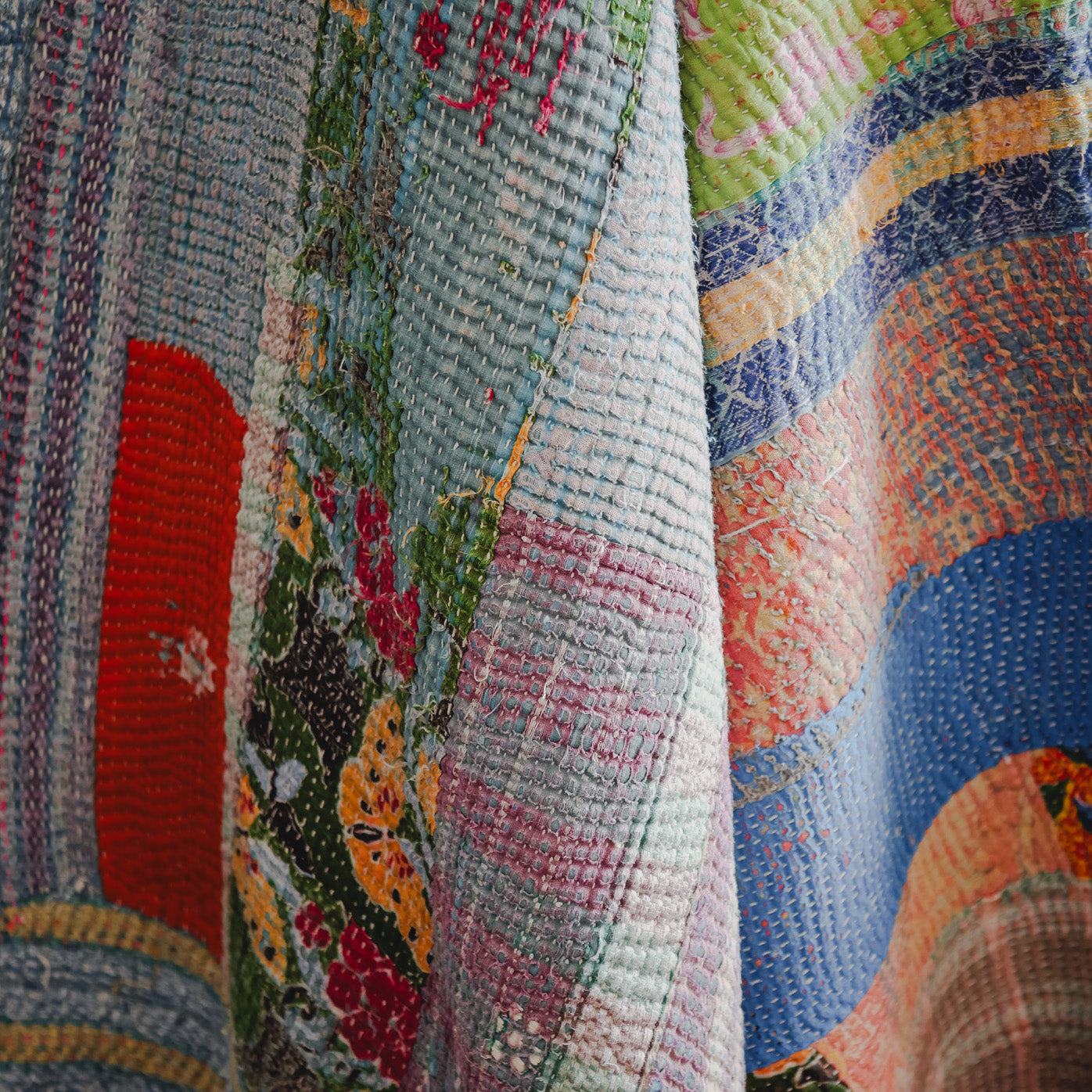 The word 'kantha' refers to a type of running stitch embroidery, which was traditionally used to stitch several layers of cotton together to make a quilt or bedcover or cushion. Often the layers were repurposed saris. Vintage kanthas are beautifully soft and often have small imperfections or patches where they have been mended. Each one is unique and this only adds to their charm.
