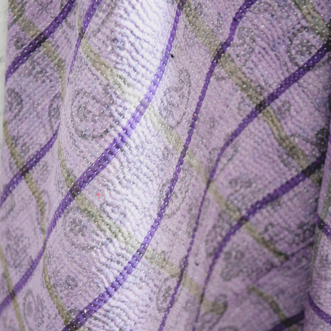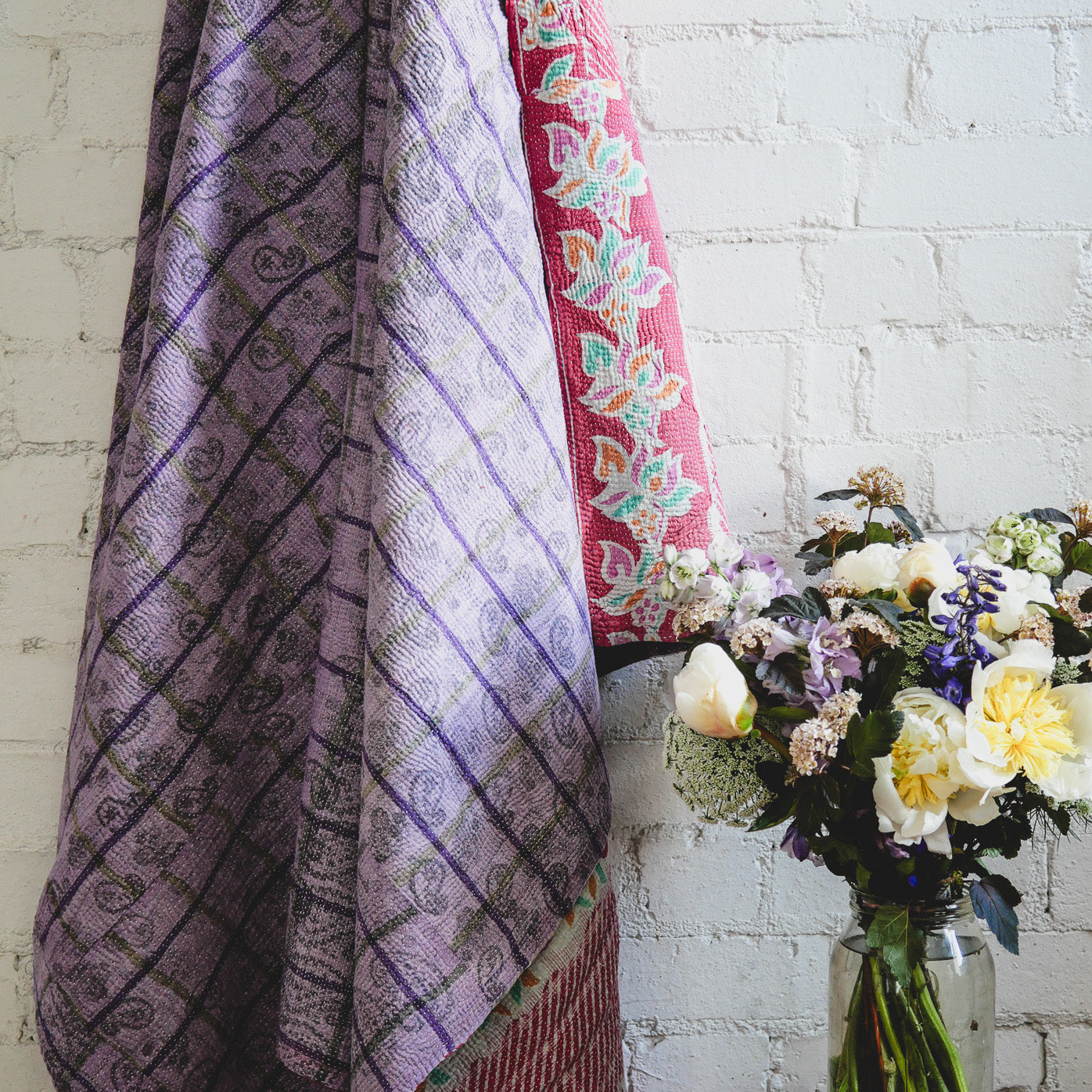 The word 'kantha' refers to a type of running stitch embroidery, which was traditionally used to stitch several layers of cotton together to make a quilt or bedcover or cushion. Often the layers were repurposed saris. Vintage kanthas are beautifully soft and often have small imperfections or patches where they have been mended. Each one is unique and this only adds to their charm.