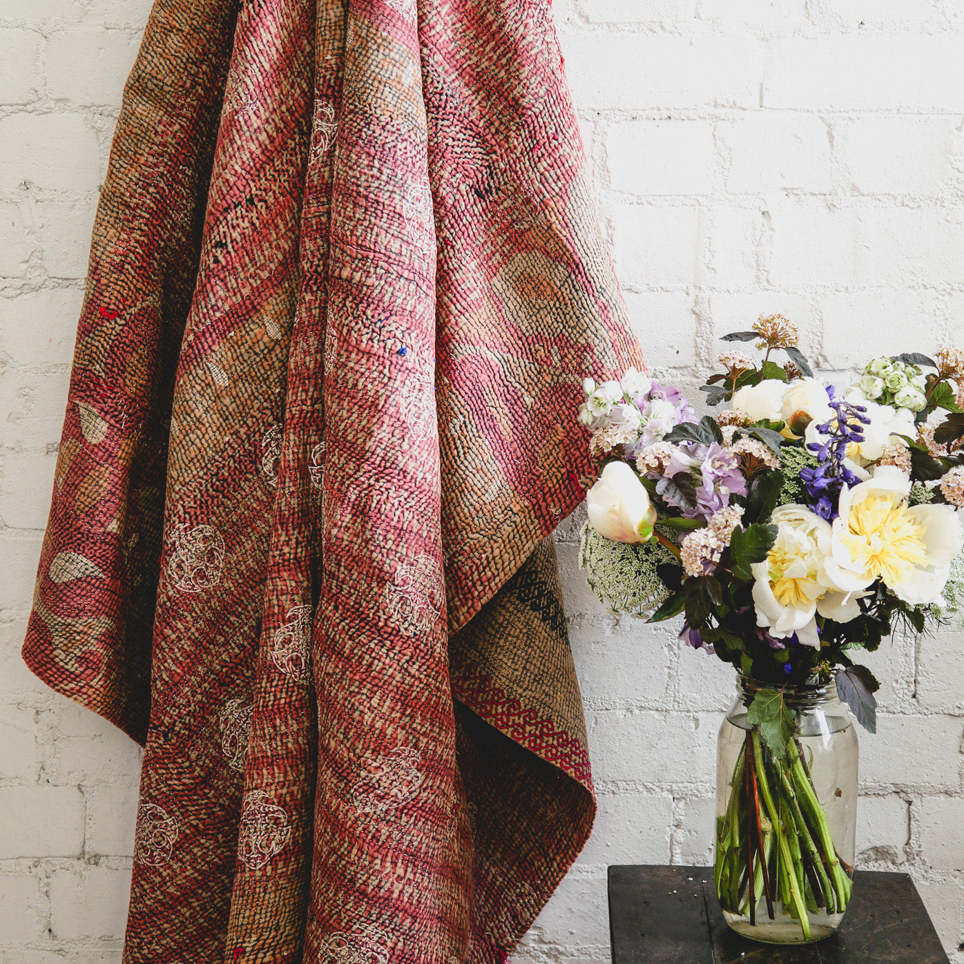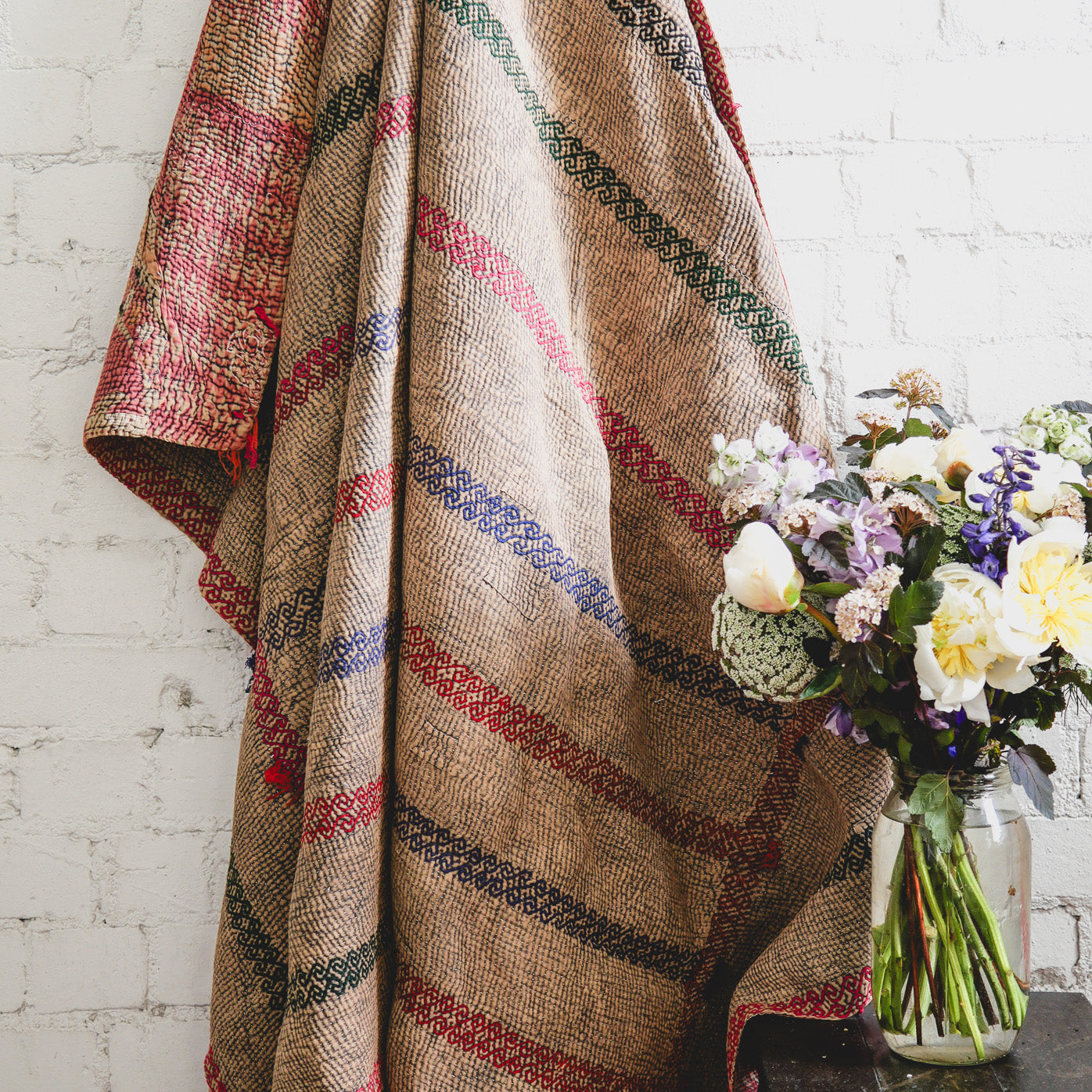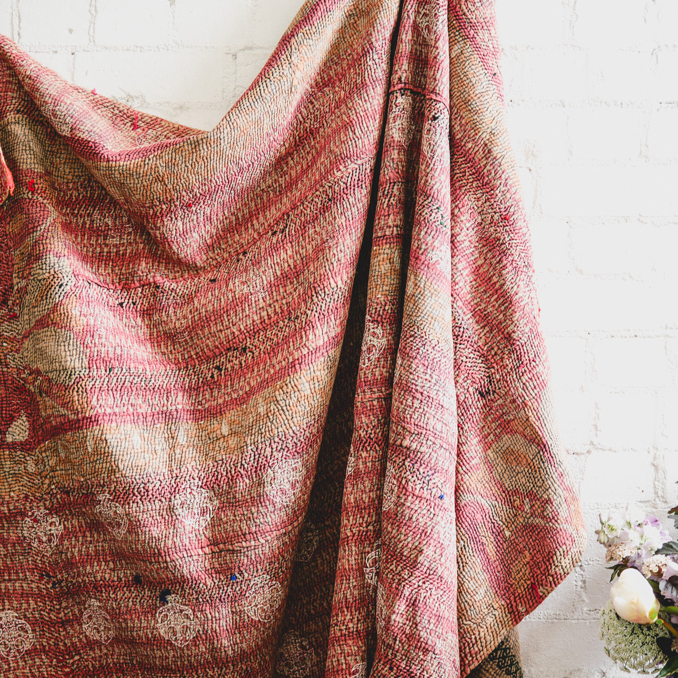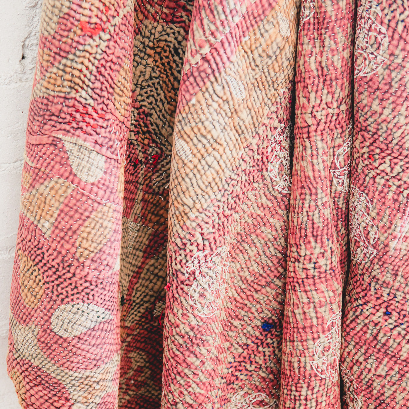 The word 'kantha' refers to a type of running stitch embroidery, which was traditionally used to stitch several layers of cotton together to make a quilt or bedcover or cushion. Often the layers were repurposed saris. Vintage kanthas are beautifully soft and often have small imperfections or patches where they have been mended. Each one is unique and this only adds to their charm.