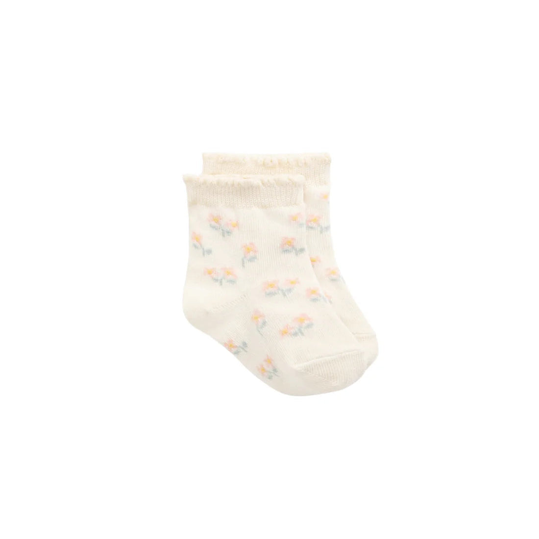 The Meadow Jacquard Sock in Larissa Milk is a beautifully soft and breathable essential for your little one. Crafted in a creamy milk tone, these socks feature a delicate jacquard floral pattern with tiny yellow flowers and green stems, finished with ribbed cuffs for a snug and gentle fit.
