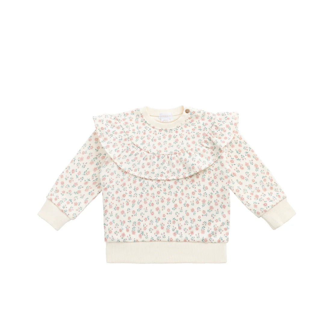 The Mckinley Sweatshirt – Posy Garden Pink is a beautifully soft and feminine piece, featuring a delicate floral print of pink and blue blossoms on a creamy white base. With long sleeves, ribbed cuffs and hem, and a ruffled collar that extends over the shoulders, this sweatshirt adds a dainty touch to everyday comfort.