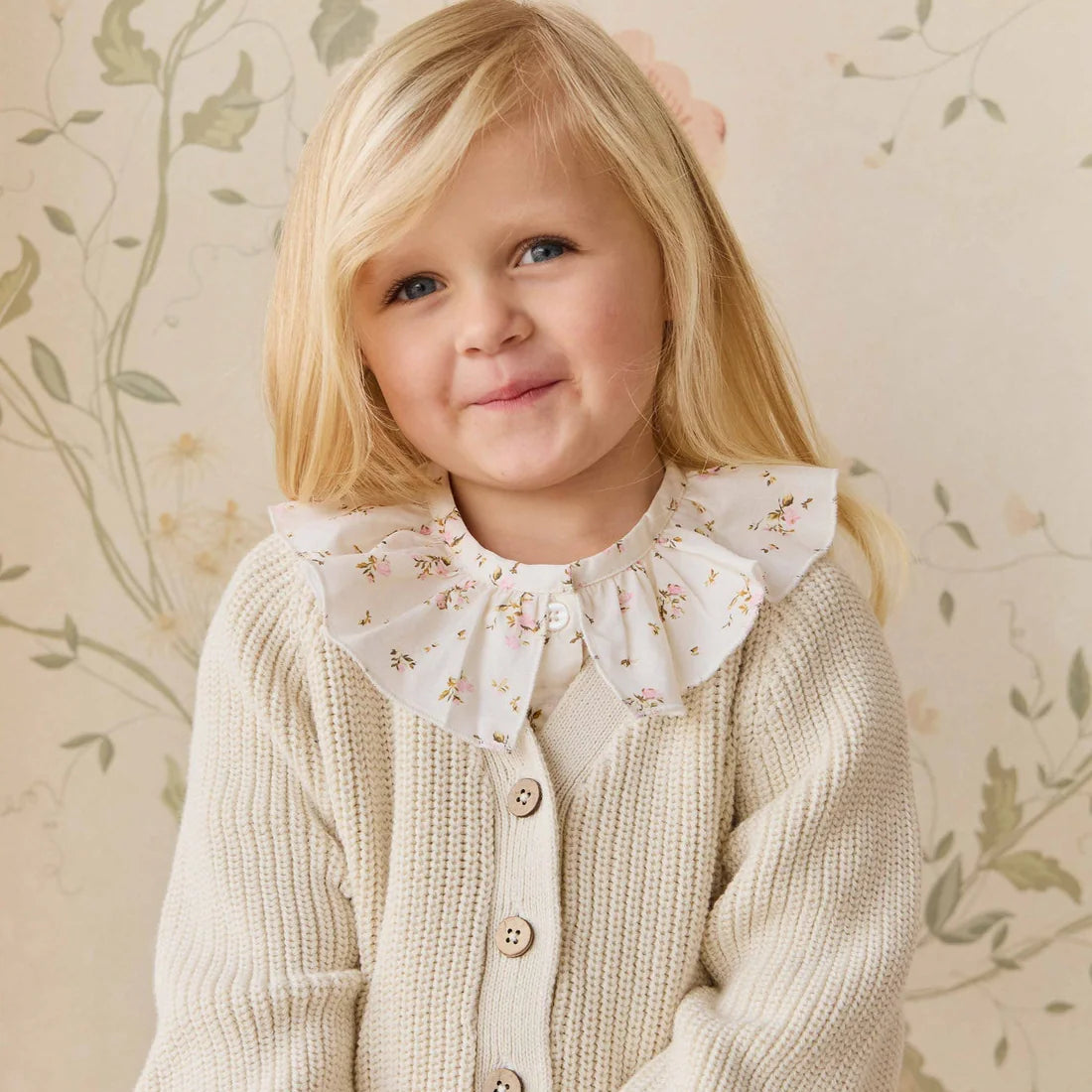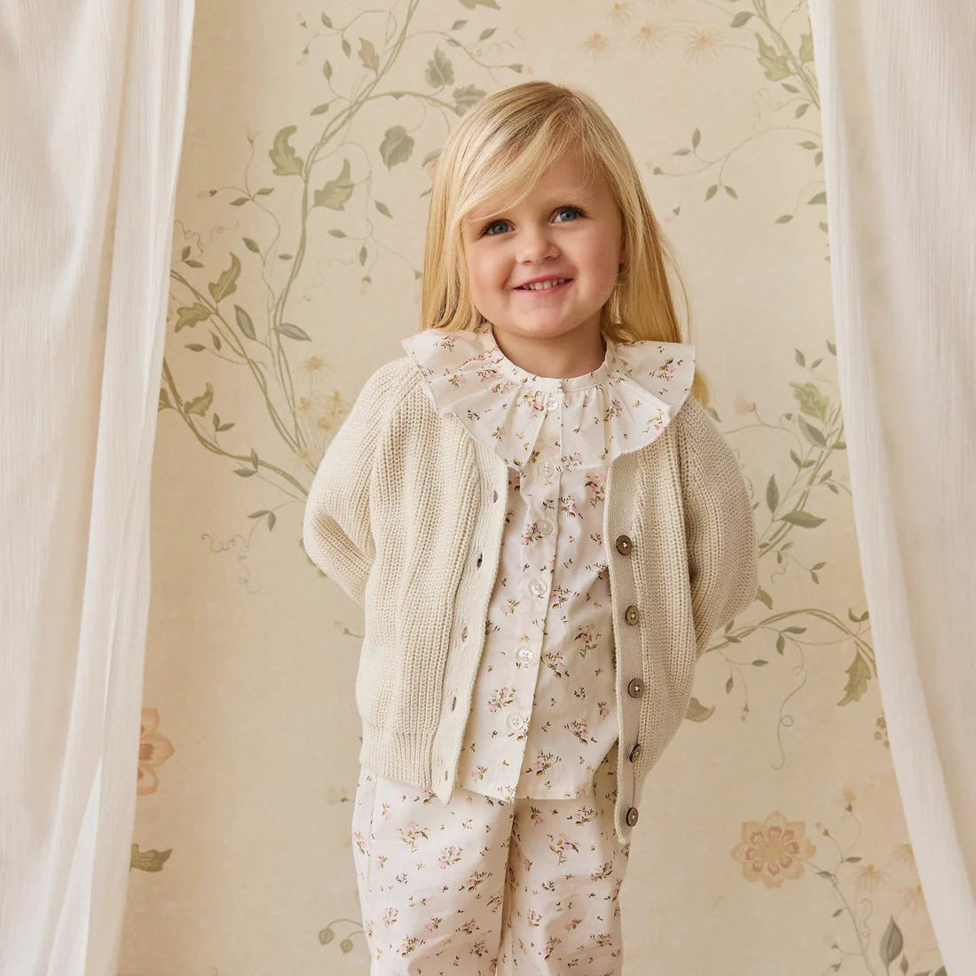 The Paloma Cardigan in Vanilla is a timeless layering piece designed to keep your little one cozy and stylish. Featuring a classic V-neck silhouette, ribbed cuffs and hem, and delicate coconut buttons, this cardigan is crafted from 100% Cotton for breathable warmth and everyday comfort.