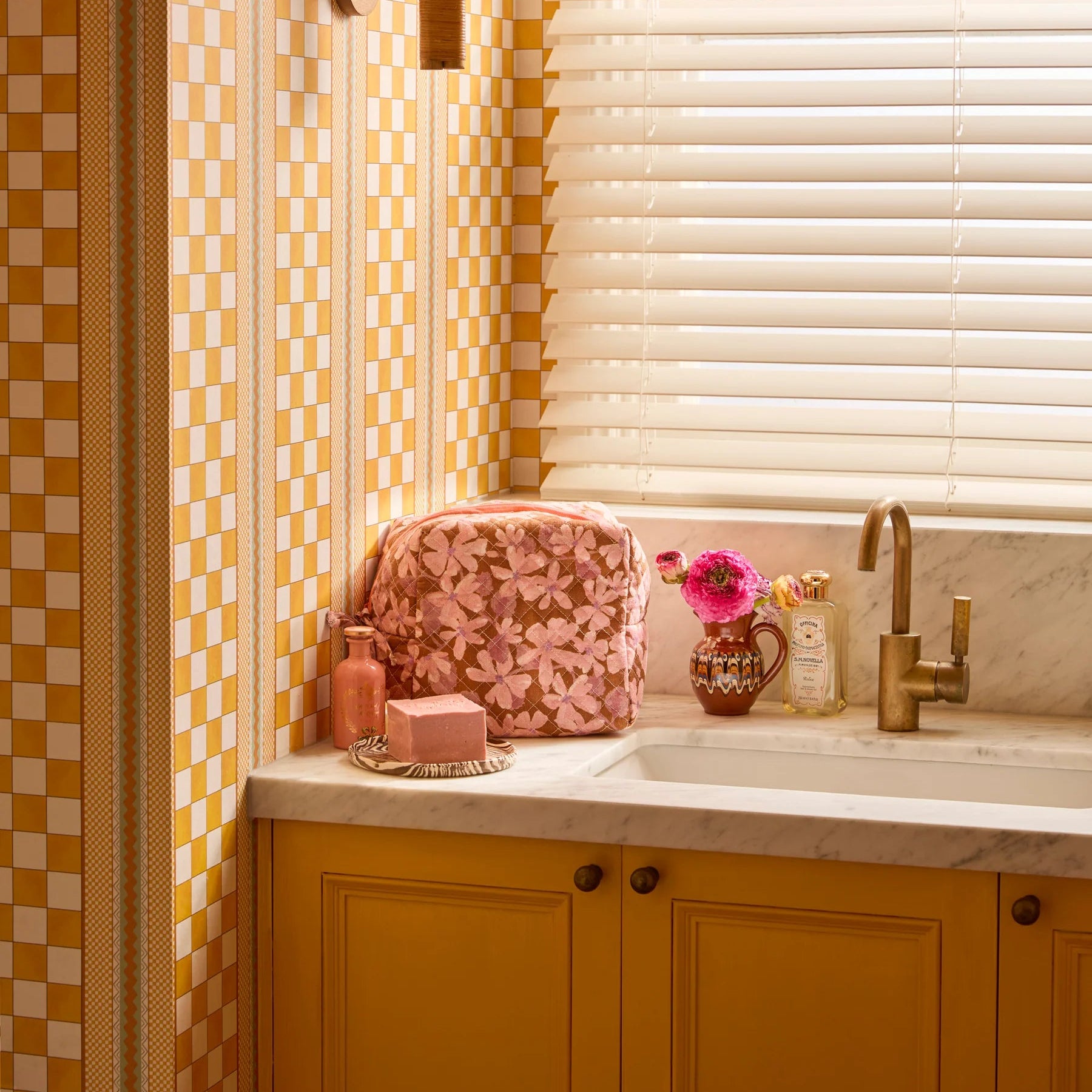 Crafted from a durable quilted linen and finished with Bonnie’s signature artwork, the Violet Tan Medium Toiletry Bag brings a balance of beauty and practicality to everyday organisation.