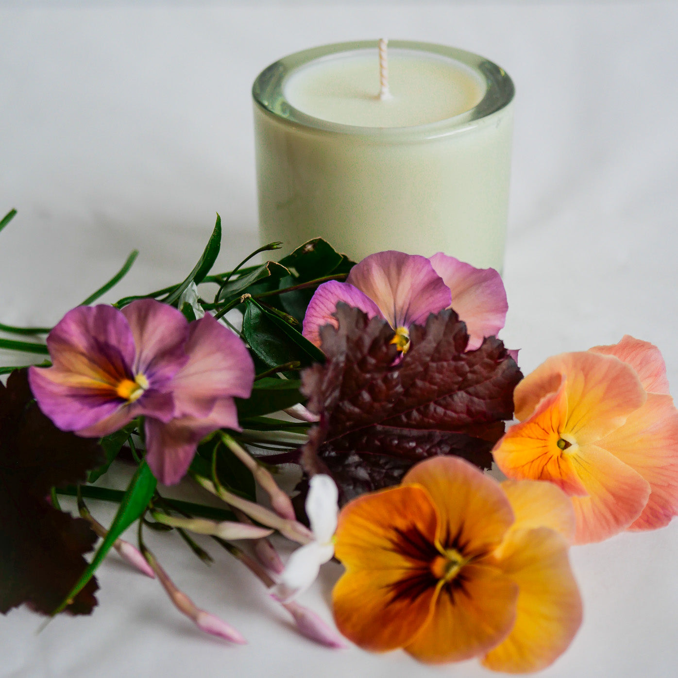 85 G Votive Candle in glass, approx 15 hours burn time.