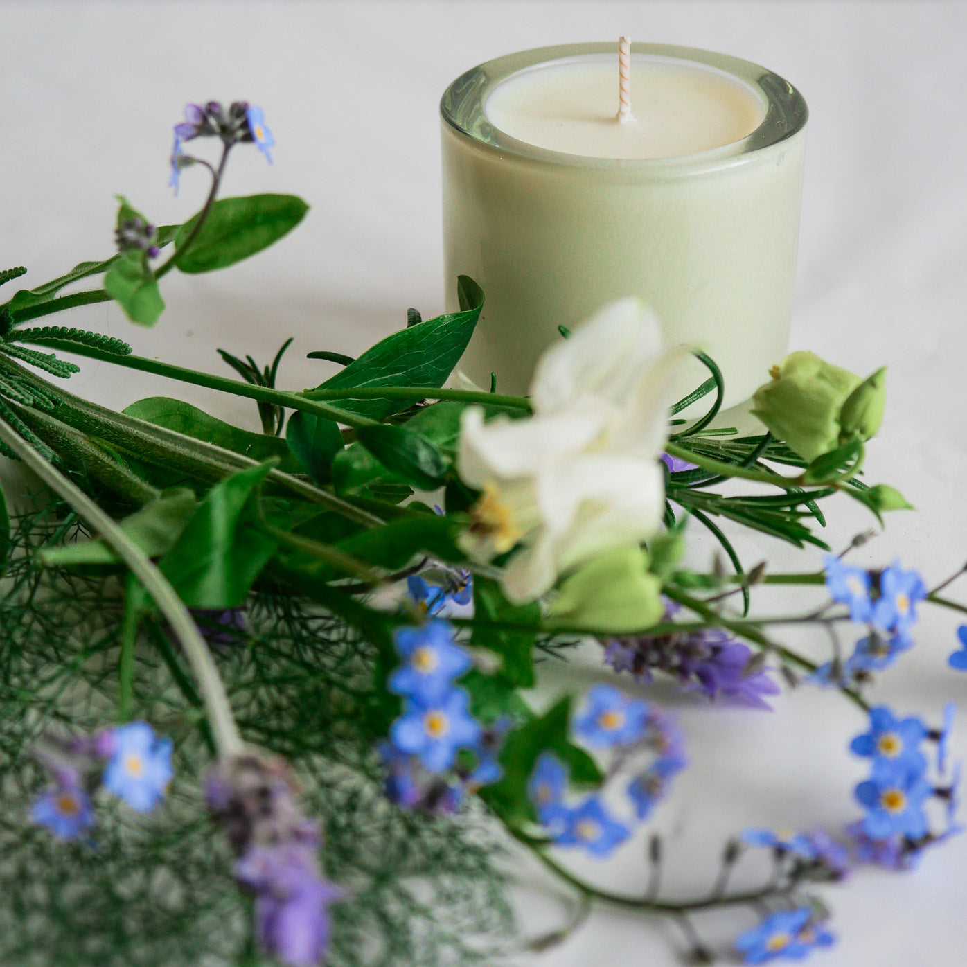 85 G Votive Candle in glass, approx 15 hours burn time.
