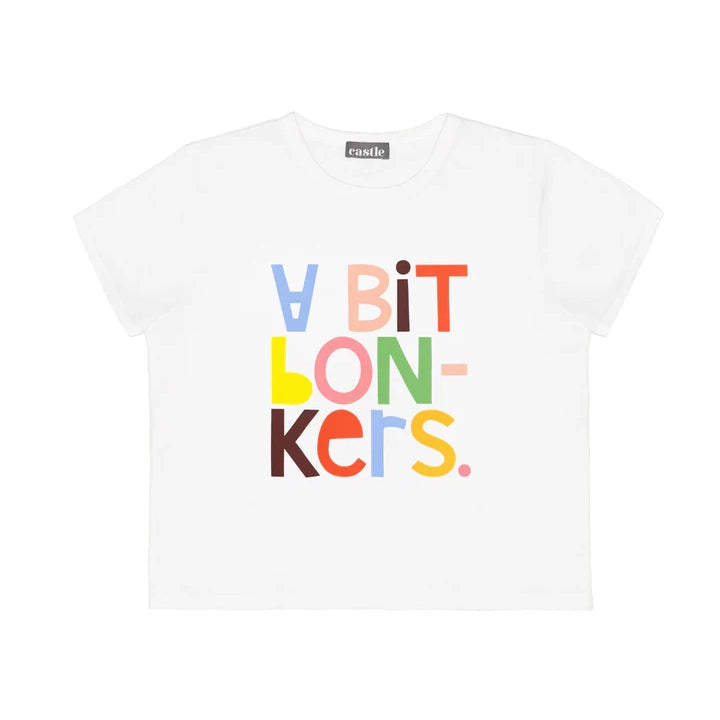 A BIT BONKERS white cotton regular fit tee shirt with multi colour print.