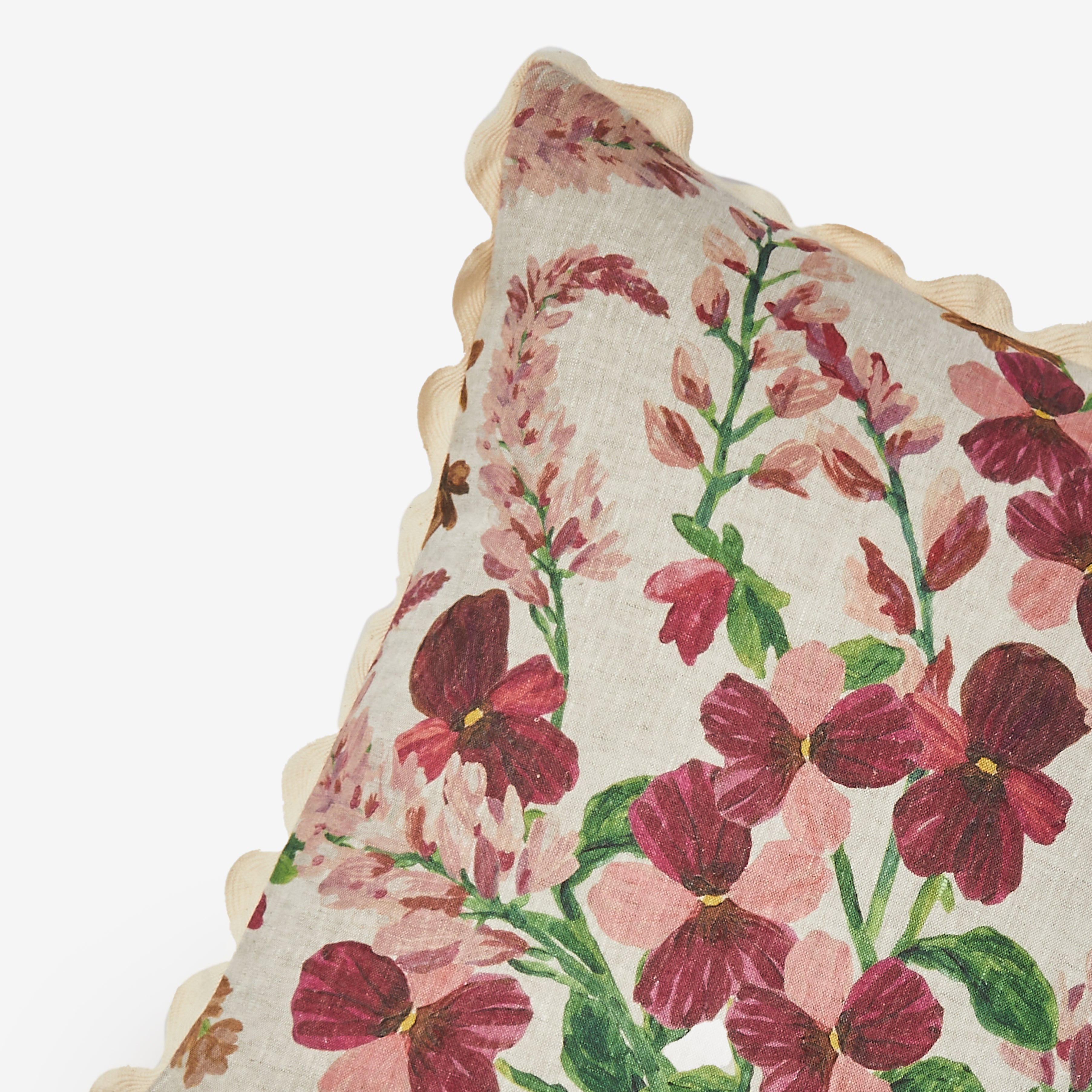 Lupin Multi linen cushion featuring hand-painted lupin design in a multi colours across an oatmeal linen base. A pretty floral design that adds beauty to your cushion styling. Lupin multi cushion is printed on both sides and finished with a tactile cream scallop trim.