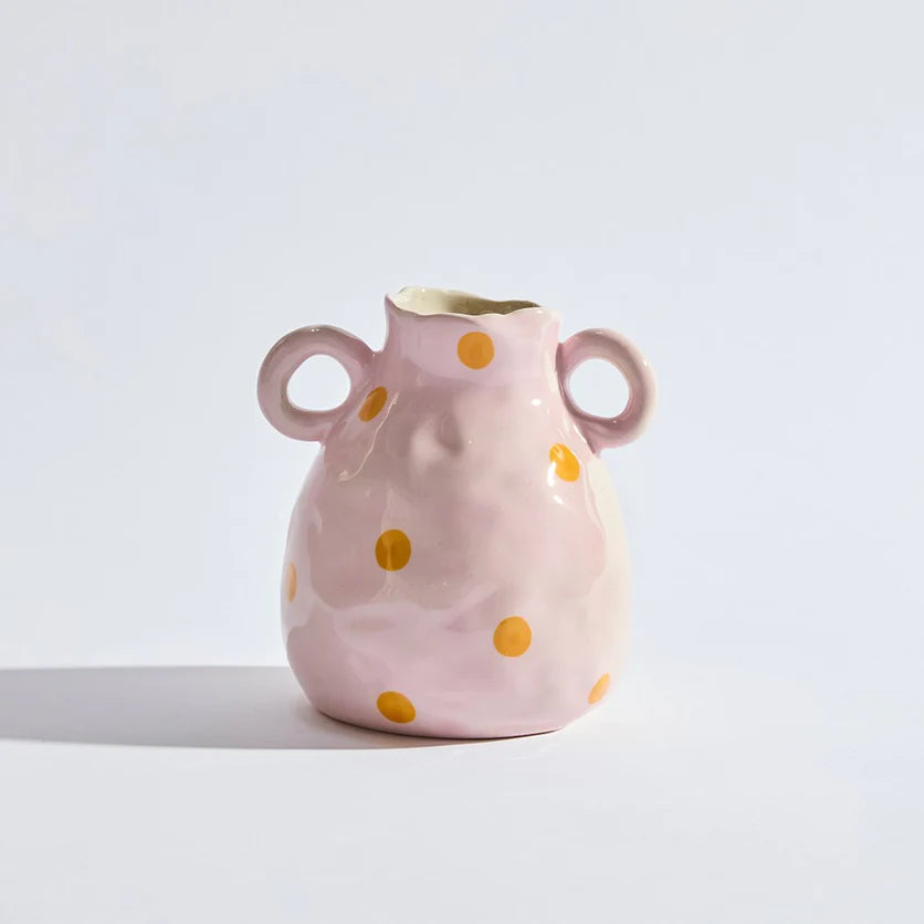 Whimsical by nature, sculptural by design. The Portico Vase delights with its curvy silhouette, double handles, and painterly polka dots—each one uniquely applied by hand. Whether in dusky jade or sun-kissed cream, this joyful piece brings a touch of coastal nostalgia to any shelf or table.