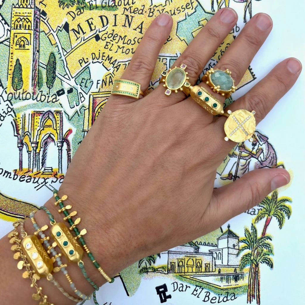 Chunky chains, oversized rings and long golden layers intertwine with organic stones from rich shades of green to rose pink tourmalines. Creating pieces that feel both ancient and modern.