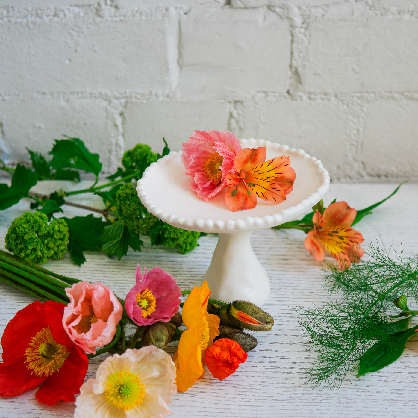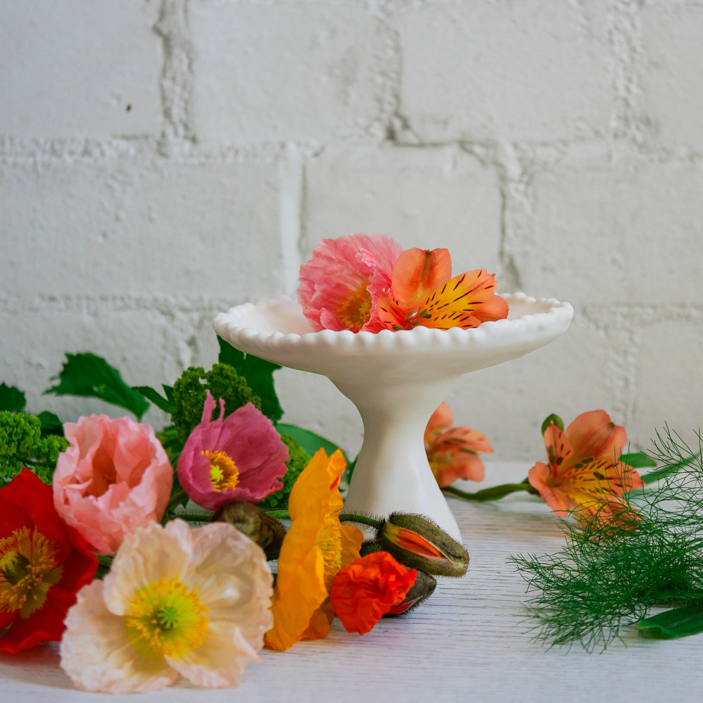 Hand sculpted, shapely elegant, classicly 'Pip Woods wonky' pure creamy white puffball pedestal dish