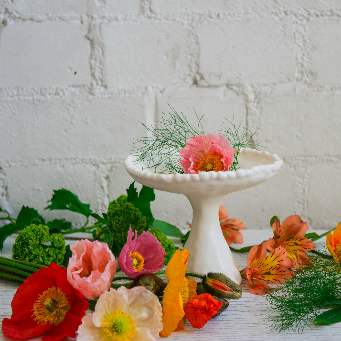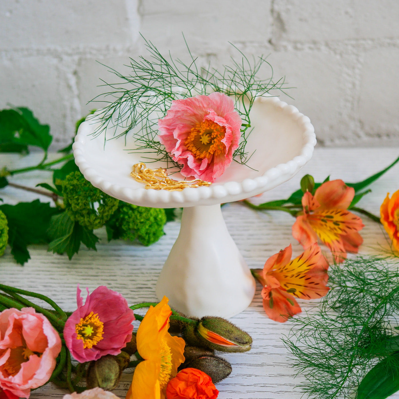 Hand sculpted, shapely elegant, classicly 'Pip Woods wonky' pure creamy white puffball pedestal dish