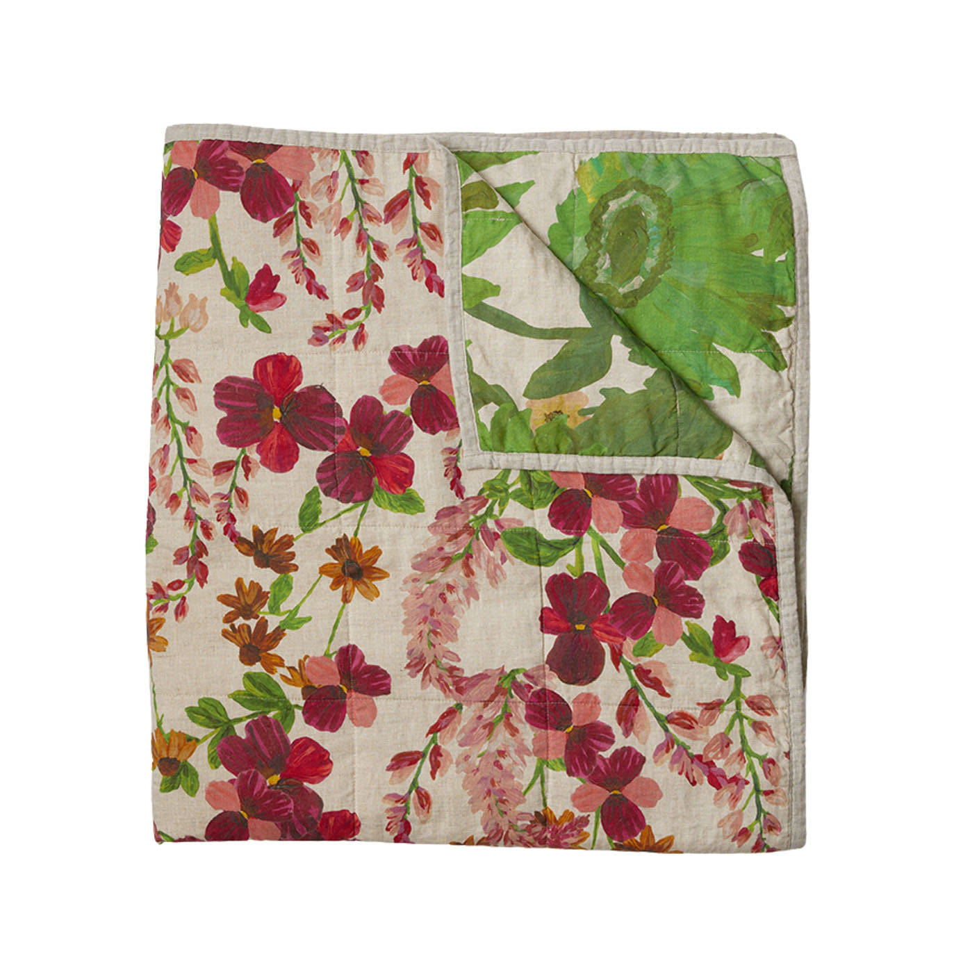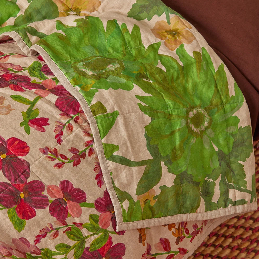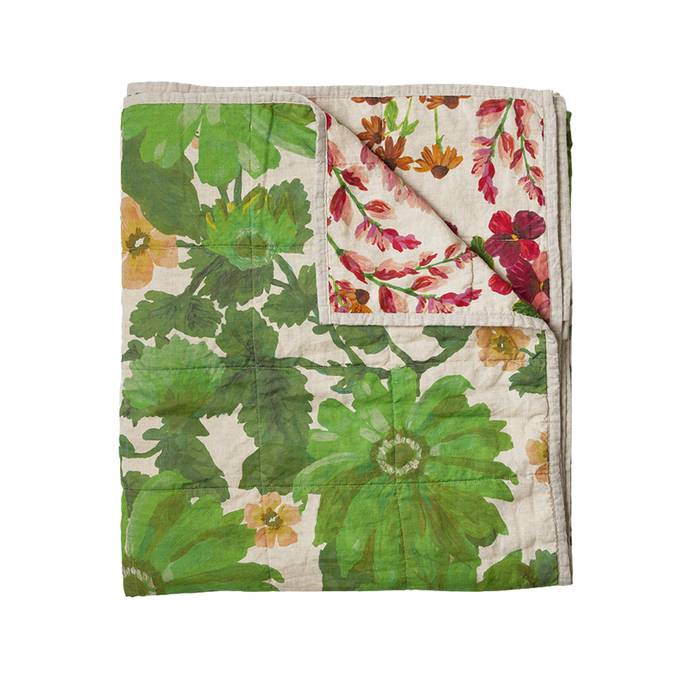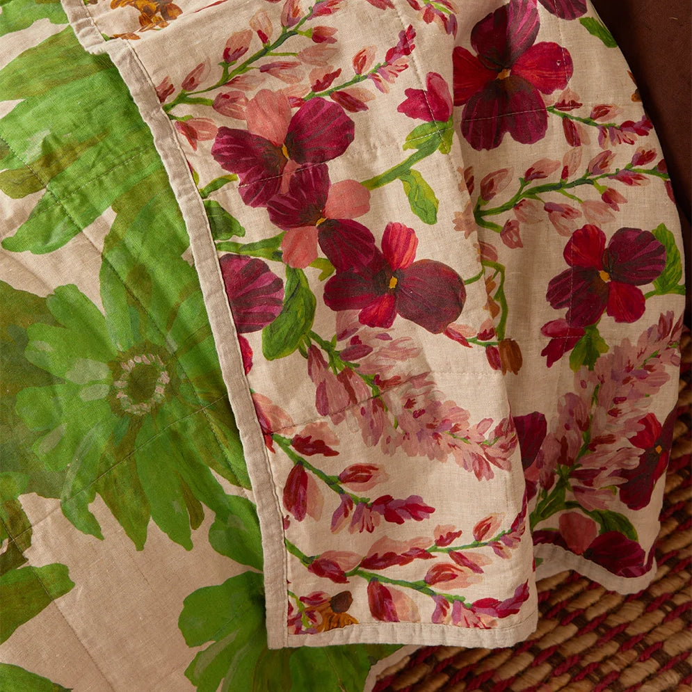 Bonnie & Neil's Lupin Multi & Marigold Leaf Linen Quilted Throw is a French flax linen reversible throw. A painterly, garden-inspired piece that works beautifully both ways - rich reds, pinks and greens on a natural linen ground on one side, and the hand-drawn Marigold Leaf print on the other. Crafted from French flax linen with a beautifully textured quilt stitch, this reversible throw is perfect for layering across your linen bedding or draping over your favourite chair.