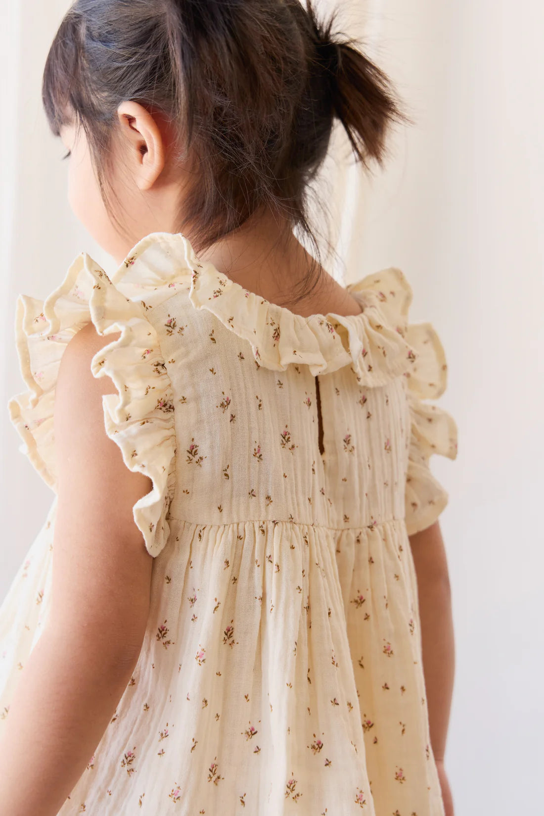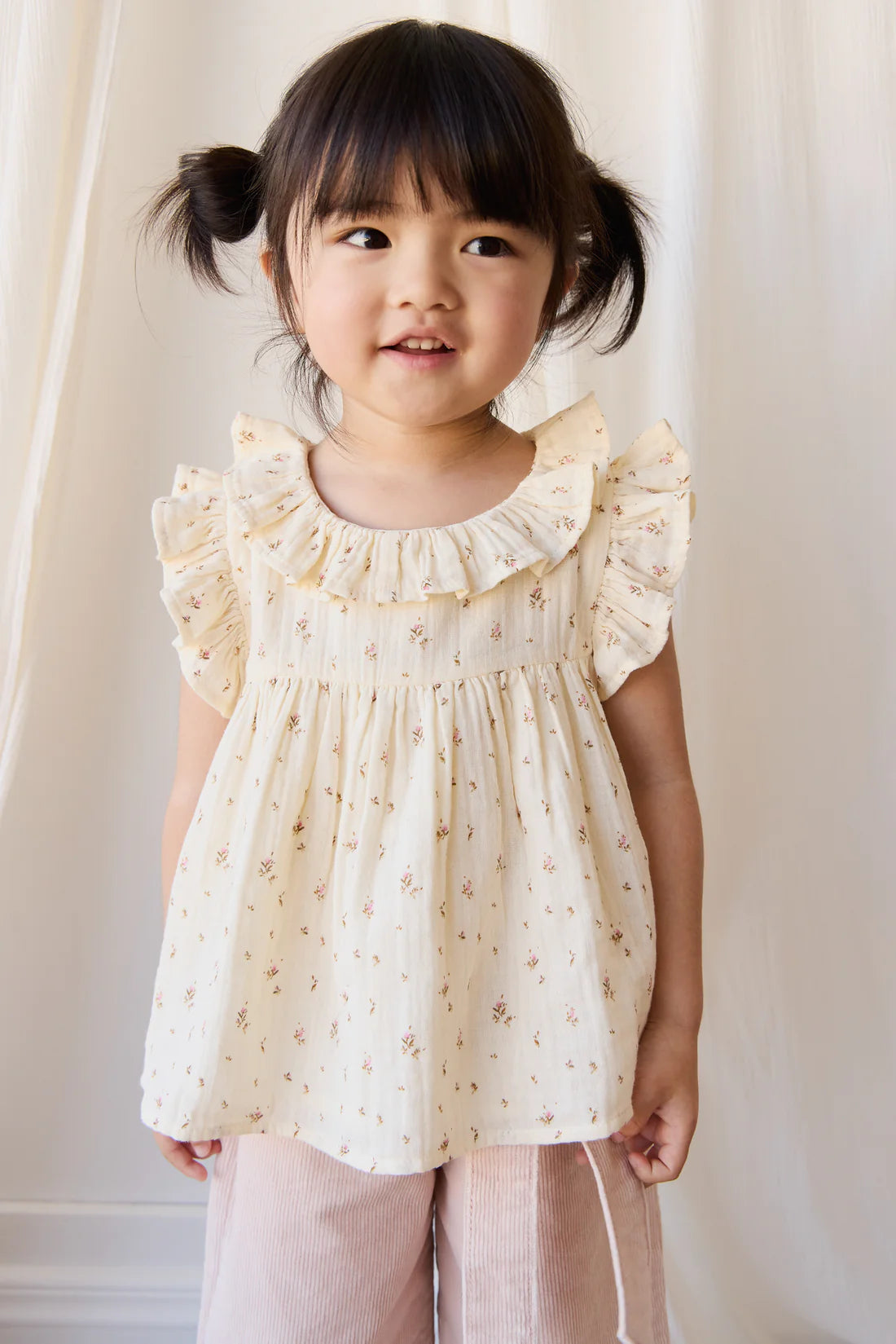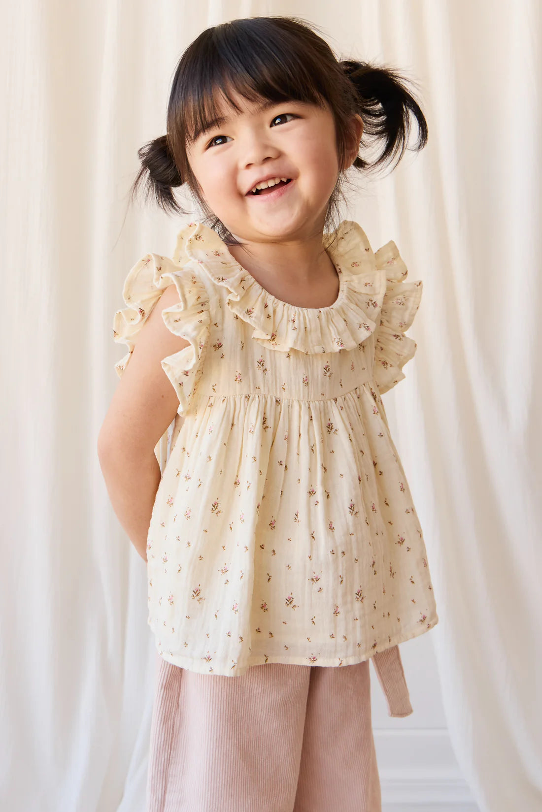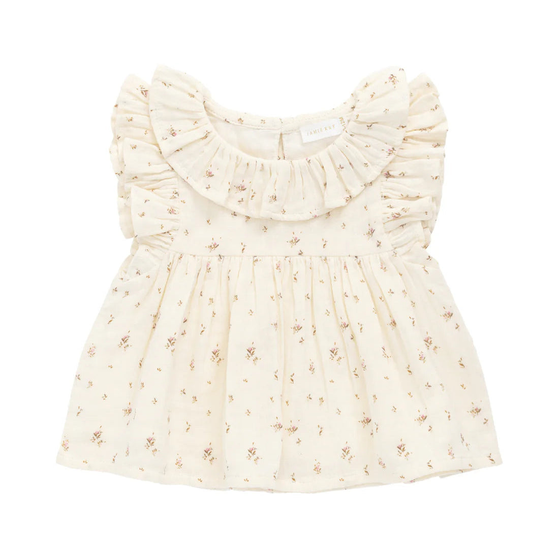 The Organic Cotton Muslin Banks Blouse – Dina Antique is a beautifully dainty piece, perfect for layering or wearing on its own. Featuring a soft antique hue with a scattered floral print, this blouse includes a ruffled collar that gently cascades over the shoulders, adding a touch of vintage charm. The gathered waistline creates a subtle flare, making it both comfortable and elegant.