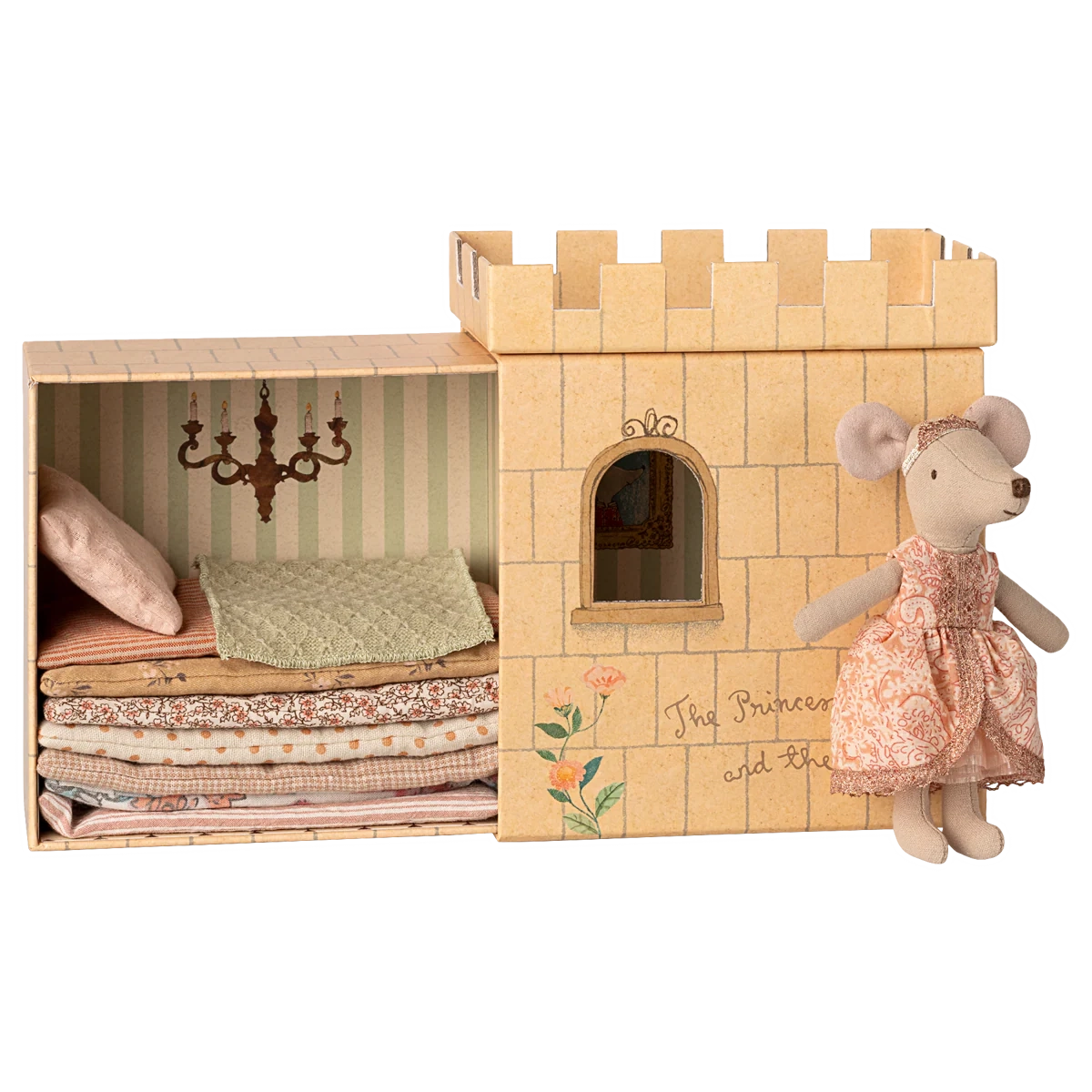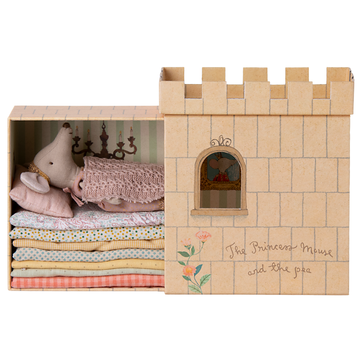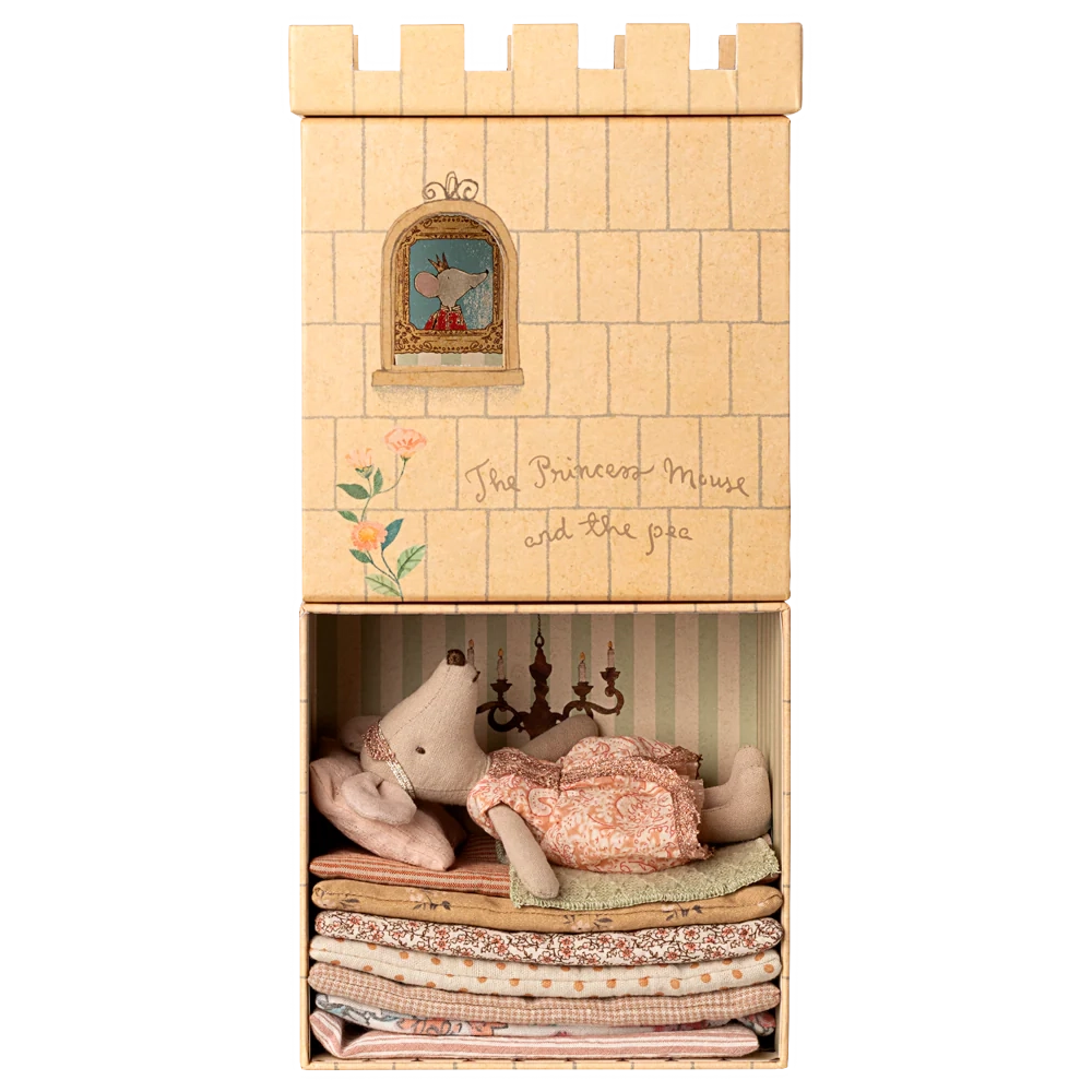 Become enchanted with the newest Maileg version of the Princess and the Pea. This Princess, who wears a stunning sparkle dress, comes in a keepsake castle box that slides open and closed. Just as in the original fairytale, the princess mouse still feels the pea and has a terrible night's sleep, even with the many mattresses that come in this cute set. How charming!